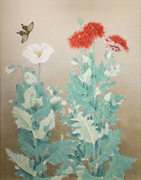 金を背景にくっきりと浮かび上がる、赤と白の罌(け)粟(し)の花。伝統的な表現の中に、色遣いや筆致にどこか現代的なモダンさが感じられる画面である。